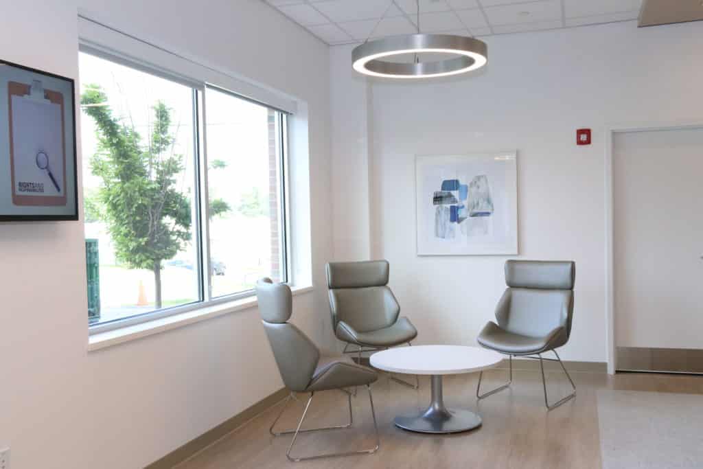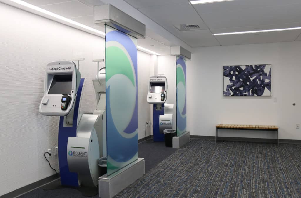 Holden Location, Reliant Medical Group Waiting room lined with chairs Exam rooms Waiting room with chairs Computer screen in the exam room with Reliant logo on it Registration desk at the Holden pediatrics waiting room